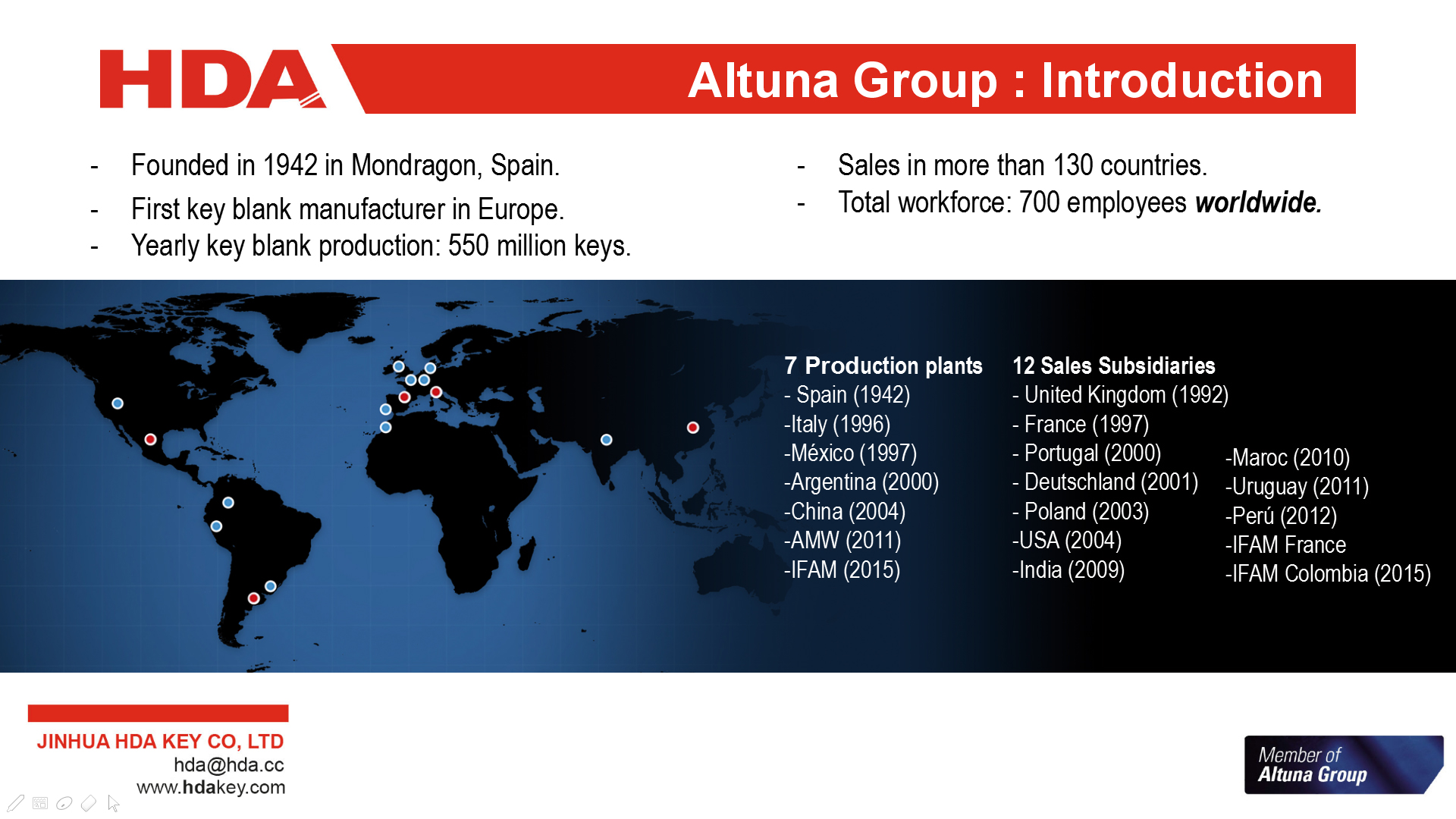 2005年,與歐洲三大鑰匙坯生產企業之一的西班牙JMA集團成立合資公司--金華HDA鑰匙有限公司。 2007年,轉為西班牙JMA集團獨資子公司。